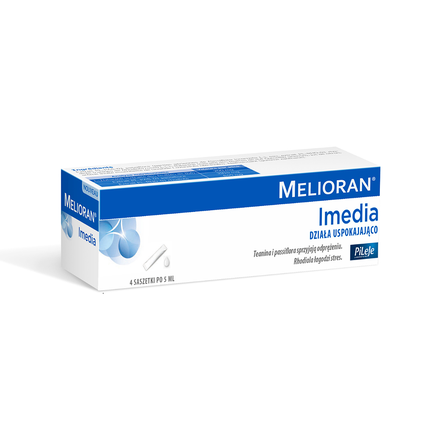 Melioran Imedia na bazie specjalnie wyselekcjonowanych składników: ekstraktów z L-teaniny, passiflory oraz rhodioli przeznaczony jest dla osób potrzebujących odprężenia w sytuacjach okazjonalnego stresu lub oczekiwania. Teanina i passiflora sprzyjają odprężeniu. Rhodiola łagodzi stres. Przeciwwskazania: Niezalecane dla dzieci poniżej 12 roku życia, kobiet w ciąży lub karmiących piersią oraz osób z chorobą afektywną dwubiegunową. W przypadku jednoczesnego stosowania leków psychotropowych skonsultuj się z lekarzem. Zaleca się monitorowanie stanu zdrowia jeśli Melioran przyjmowany jest jednocześnie z lekiem na nadciśnienie tętnicze.