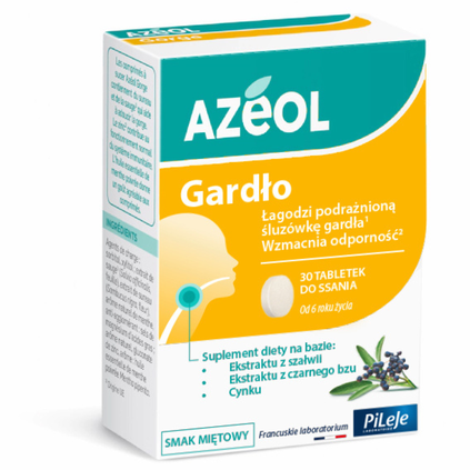 Azeol Gardło jest suplementem diety opracowanym na bazie: ekstraktu z szałwii lekarskiej, ekstraktu z czarnego bzu oraz cynku. Szałwia łagodzi podrażnioną śluzówkę gardła, a cynk pomaga w prawidłowym funkcjonowaniu układu odpornościowego. Przeciwwskazania: niewskazany u kobiet w ciąży lub karmiących oraz dzieci poniżej 12 roku życia. Nie przekraczać zalecanej porcji do spożycia w ciągu dnia, nadmierne użycie może wywołać efekt przeczyszczający.