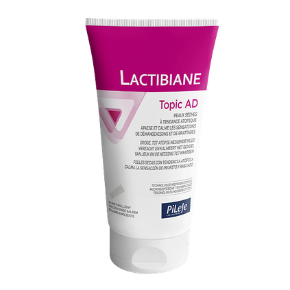 Lactibiane Topic AD to balsam zmiękczający skórę suchą z tendencją do atopii. Koi oraz łagodzi uczucie swędzenia. Zalecany do stosowania już od 1 dnia życia. Balsam probiotyczny powstał na bazie aktywnych składników zapewniających kompleksowe działanie dla skóry atopowej: Lizat fermentacyjny Lactobacillus zwiększa różnorodność komensalnej mikroflory skóry i utrzymuje równowagę mikrobiotyczną skóry. Prebiotyk α-gluko-oligosacharydowy chroni mikrobiotę skóry. LPC i witamina B3 pomagają wzmocnić barierę skórną. Laboratoire PiLeJe opracowało pierwszy balsam zmiękczający z linii Microbiota, aby zaspokoić potrzeby skóry ze skłonnością do atopii. Lactibiane Topic AD jest odpowiedni dla niemowląt, dzieci i dorosłych.