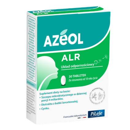 Suplement diety na bazie tyndalizowanego szczepu mikrobiotycznego Latilactobacillus sakei LA907 w dziennej porcji 4 miliardów w tabletce, ekstraktu z babki lancetowatej i cynku. Zmieniające się pory roku mogą znacznie obciążyć układ odpornościowy. Tabletki Azeol ALR łączą w sobie dwa obszary specjalistycznej wiedzy laboratorium PiLeJe: wiedzę na temat mikrobioty i wiedzę na temat roślin. Tyndalizowany szczep mikrobiotyczny i ekstrakt z babki lancetowatej zostały rygorystycznie wyselekcjonowane i tworzą wyjątkowe połączenie. Cynk przyczynia się do prawidłowego funkcjonowania układu odpornościowego. Przeciwwskazania: niewskazany u kobiet w ciąży lub karmiących oraz dzieci. Nie przekraczać zalecanej porcji do spożycia w ciągu dnia.Rekomendowany do suplementacji w: