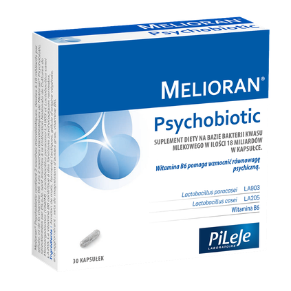 Melioran Psychobiotic jest specjalnie opracowanym suplementem diety przeznaczonym dla osób w sytuacjach regularnego stresu czy lęku. Suplement diety na bazie specjalnie wyselekcjonowanych szczepów mikrobiotycznych z dodatkiem witaminy B6. Przeciwwskazania: Ten suplement diety nie jest zalecany do przyjmowania przez kobiety w ciąży i karmiące piersią, osoby z chorobą afektywną dwubiegunową i dzieci.