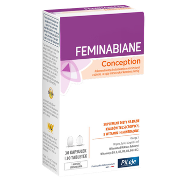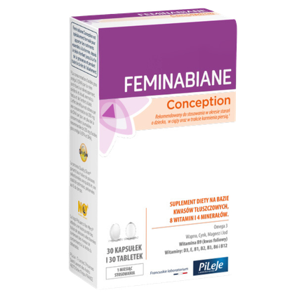 Feminabiane Conception jest specjalnie opracowanym suplementem diety dostarczającym składniki odżywcze niezbędne dla organizmu kobiety w okresie starań o dziecko, w trakcie ciąży aż do zakończenia karmienia dziecka piersią. Suplement diety na bazie kwasów tłuszczowych Omega 3, 8 witamin oraz 4 minerałów.